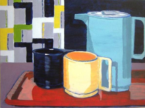 The painting above, on board, was based on a photo of a jug, mugs and a tray (no!) I saw in a home interiors magazine a while ago that really appealed to me. The colours and form were calling my name. I added in the background with a little inspiration from Eduoard Benedictus (1878-1930), an Art Deco designer from Paris.