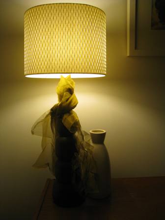Step 6. Functional, yes. Good-looking, mmmmhhh better if you couldn’t see the black tape and bottom of the light fitting. Think of fringing the bottom of shade. Try a few random things from my sewing box and voila! settle on some sheer chartreuse fabric tied around. A little like a scarf.