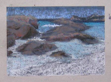 Just a little pastel sketch to brush off the cowebs and get used to colour selection etc.,. again. I used textured Canson Mi-Teintes paper (with a dark blue background) in A5 so a bit of a challenge to squeeze it all in. I used the ‘vellum’ side which produces the rough appearance – see previous post Hidden Cove to see another example of this look.